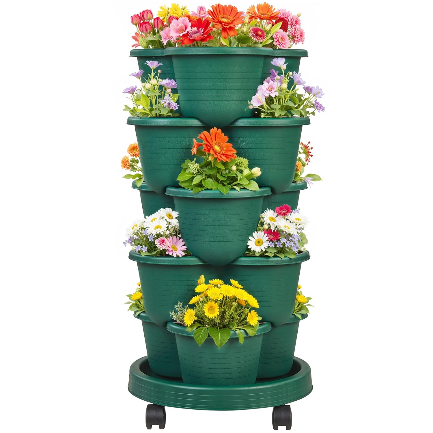 VECELO 5 Tier Vertical Garden Planter, Self Watering Stackable Planters with Wheels for Strawberries, Herbs, Flowers, Vegetables, Dark Green